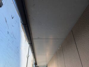 現在の工事状況ですが、上塗り1回目の作業が進んでおります。この工程は、下塗りが完了した後に選んでいただいた外壁の色を塗る作業です。最初の色塗りは、いわゆる「色塗り1回目」にあたりますが、1度の塗布ではムラや塗り残しが出てしまうことがあります。そのため、塗りムラを防ぐために2回目の上塗りも続けて行い、均一で美しい仕上がりを目指して進めています。